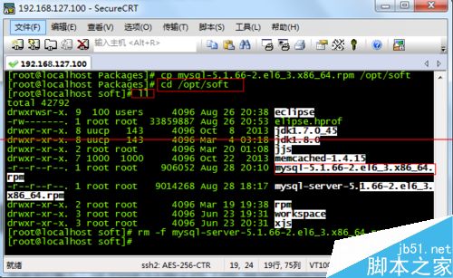 5、在命令行输入: cp mysql-5.1.66-2.el6_3.x86_64.rpm /opt/soft。把mysql-5.1.66-2.el6_3.x86_64.rpm这个包拷贝到/opt/soft目录下面。在命令行输入:cd /opt/soft。然后ll。可以看到文件已经被拷贝过去了。