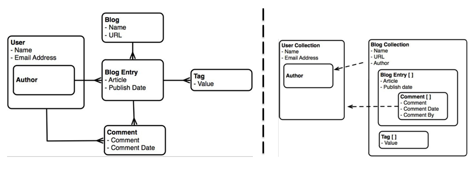 这个一个博客的数据模型,有Blog,User等表。左侧是关系模型,右侧是文档模型。这个文档模型并不是完全合理,可以作为“正反两面教材”在下文不断阐述。