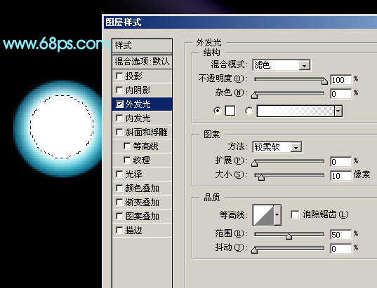 <图6> 4、新建一个图层,用椭圆选框工具拉一个正圆选区,填充白色后,再创建图层调成图层样式,选择外发光,参数设置如图7,效果如图8。