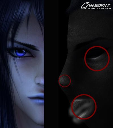图12高光贴图我认为是比较重要的部分。尽量加强对比度,叠加的纹理材质也可以重一些。尤其在额头,眼睛周围,鼻头,锁骨的地方要做的比较明显。对于有透明通道的部分,高光贴图一定要填充成黑色。不然渲染后在透明的地方会出现奇怪的高光。(图13)