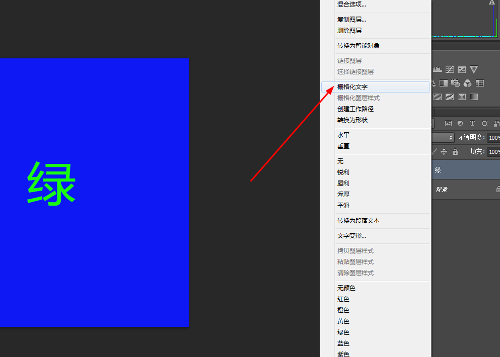 1、在ps软件中,新建一个800*800的文档,背景色为蓝色,写上绿色的字体,然后点击字体的右键栅格化文字图层,如图所示