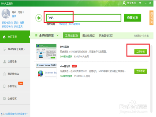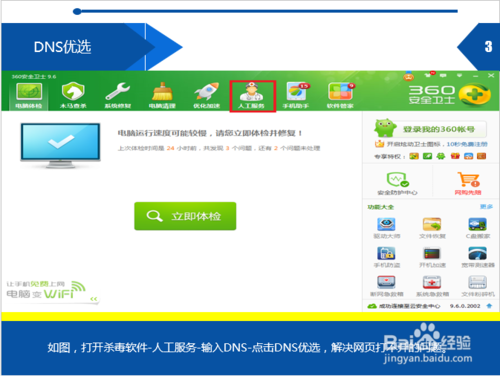 如图,打开杀毒软件-人工服务-输入DNS-点击DNS优选,解决网页打不开的问题。