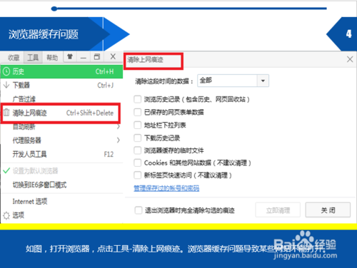 如图,打开浏览器,点击工具-清除上网痕迹。浏览器缓存问题导致某些网站不能打开。