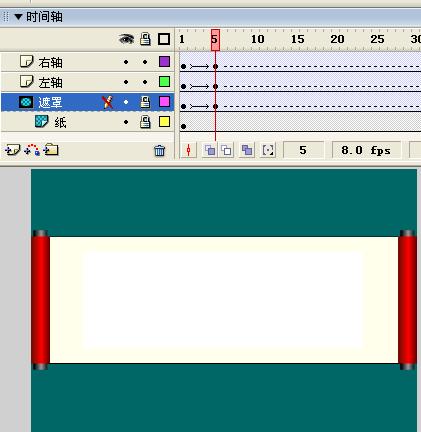 点击左轴层的第一帧,右键—选择创建补间动画,在第5帧处点击右键—插入关键帧,选择场景中的卷轴,将其移动到文档的最左边。用同样的方法,将右轴层的右轴移动到文档的最右边。
