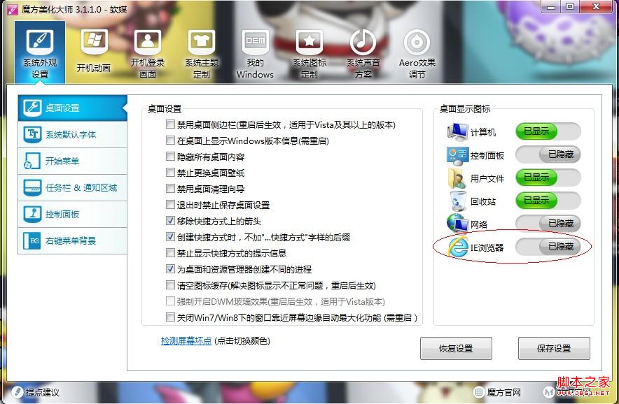 首先下载魔方美化大师,然后点击进入魔方美化大师软件,再点击“系统外观设置”,之后选择“桌面设置”,然后将桌面显示图标中的IE浏览器设为已显示,就可以显示出来啦!如下图所示: