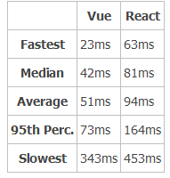 到目前为止,在现实的测试中,Vue 是优于 React 的(通常至少快20%-50%,尽管在某些情况下还要更快)。我们可以提供一个到这个参照项目的链接,但是坦率的说,所有的参照在某些方面是有缺陷的,很少有像你所写的一个真实应用。那么,让我们详细了解下吧。