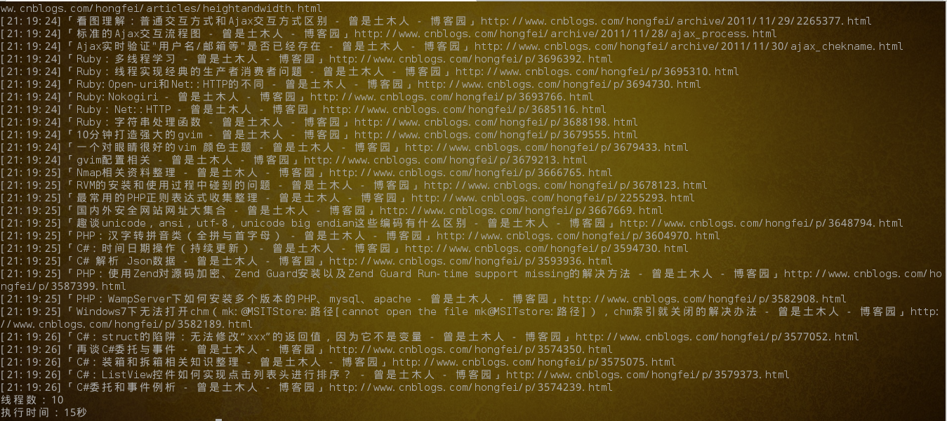 以上就是俊秀导师最近收集整理的关于Ruby中使用多线程队列(Queue)实现下载博客文章保存到本地文件的全部内容,更多相关Ruby中使用多线程队列(Queue)实现下载博客文章保存到本地文件内容请搜索靠谱客的其他文章。