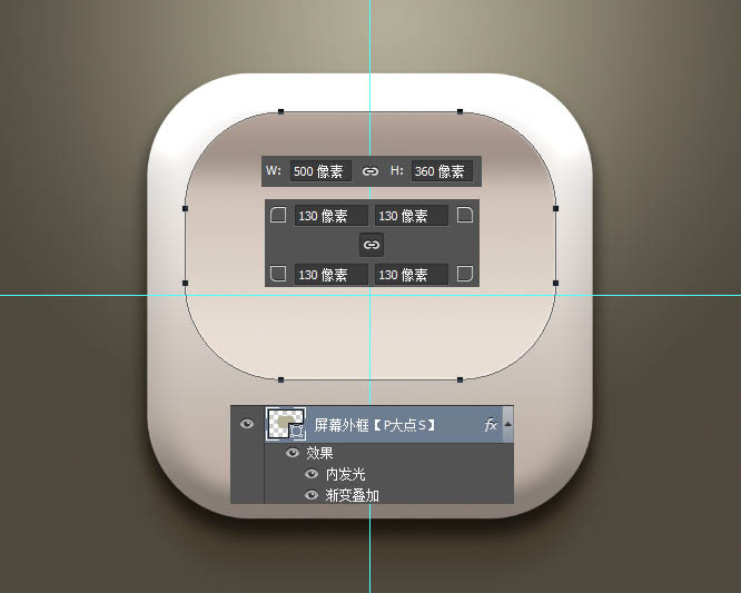 5、原图画的是一个类似椭圆的形状,我这里偷懒一下,还是画的圆角矩形,大小为500X360像素,圆角半径为130像素,添加一个图层样式。
