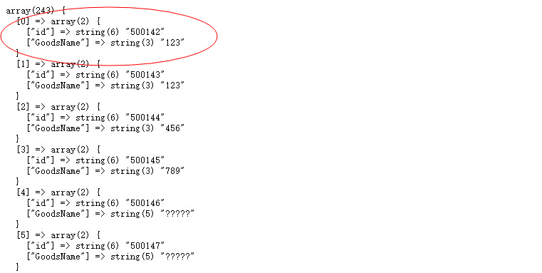 //mysql_fetch_row 提取的结果是没有查询中的字段名了(也就是没有键id,GoodsName,只有值),如下图: