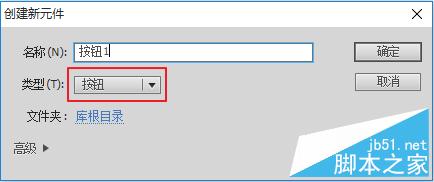 2、单击菜单"插入">“新建元件”(或按快捷键Ctrl+F8),在弹出的对话框中选择“按钮”元件类型并改名为按钮1。