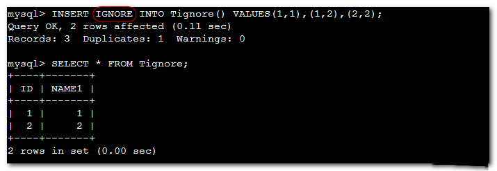 使用IGNORE如果插入的记录中存在重复值会忽略重复值的该记录行,不影响其它行的插入。