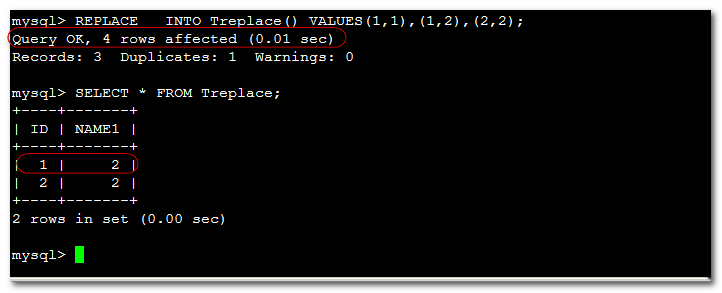 REPLACE INTO Treplace() VALUES(1,1),(1,2),(2,2);