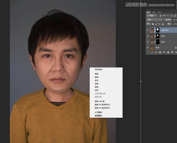 点击确认,你的脑袋就被抠出来变成一个新图层啦。Ctrl+J复制一层。命名为”头部拷贝”,Ctrl+T,调整头部大小,并用蒙版擦除多余痕迹。