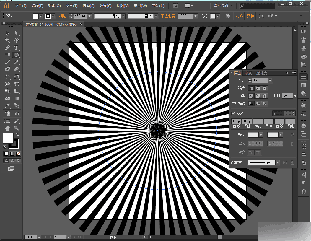 【step04】勾选描边对话框中的虚线,并填上前2个宽度值,填一样的大小,回车确认后可以看到刚才的圆形已变成放射线形状,通过改变这2个宽度值可以得到不同效果的放射线。