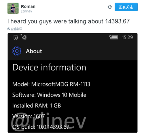 8月9日消息,此前报道了Win10一周年更新14393.67现身BuildFeed的消息,如今推特用户Roman上传了一张疑似为WP手机系统的截图,其系统版本为14393.67,这佐证了我们此前关于14393.67为最终推送版本的推断。