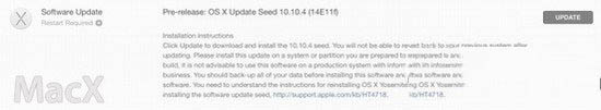 开发者可以通过Mac App Store的软件升级系统更新至OS X 10.10.4,新版本的编译号为14E11f。OS X 10.10.3新增了很多功能,包括全新照片应用,全新设计的emoji选择器,更多肤色的emoji表情。OS X 10.10.4可能只是性能增强和Bug修复。
