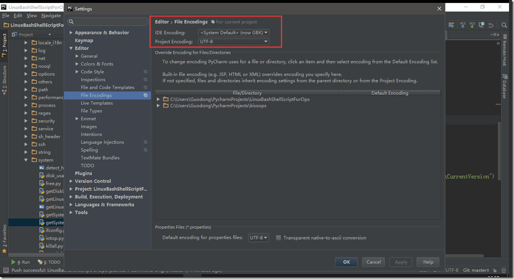 注:在PyCharm中,经常遇到Run窗口打印出的中文显示乱码,代码中没有经过正确转码是一方面,而IDE的编码设置也是一方面。如果是在Windows下开发,那么建议代码用UTF-8编写,IDE的编码则设置为“GBK”,设置方法“File”-->"Settings"-->"Editor"-->"File Encoding"-->"IDE Encoding"选择“<System Default (now GBK)>”, "Project Encoding"选择UTF-8保证代码的编码一致性。