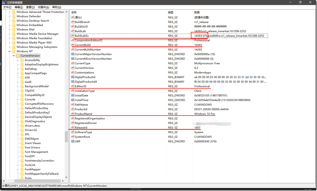 print (ProductName, EditionId, ReleaseId, CurrentBuild, BuildLabEx)