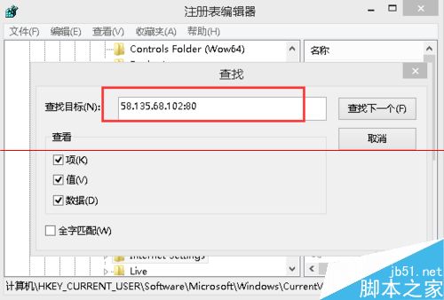 4、打开注册表编辑器点击查看下面的查找输入58.135.68.102:80因为在我这里是一直处于这个ip所以我输入来查找它。