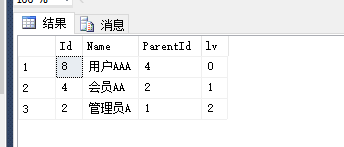 declare @level int declare @node int declare @num int declare @ResTab table ( node int not null, lv int not null ) set @level=0 -- 表示初始的等级 set @node=8 --表示初始的节点ID,即从指定的哪个节点开始查找 set @num=2 -- 指定递归层级,即循环的次数 while(@level<=@num and @node is not null) -- 如果为空就表示没有查到父级了 begin insert into @ResTab select @node,@level set @level=@level+1 select @node=ParentId from Role_CTE where Id=@node end select a.node,b.Name,a.lv from @ResTab a left join Role_CTE b on a.node=b.Id