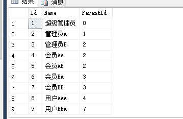create table Role_CTE ( Id int not null, Name nvarchar(32) not null, ParentId int not null ) insert into Role_CTE(Id,Name,ParentId) select '1','超级管理员','0' union select '2','管理员A','1' union select '3','管理员B','2' union select '4','会员AA','2' union select '5','会员AB','2' union select '6','会员BA','3' union select '7','会员BB','3' union select '8','用户AAA','4' union select '9','用户BBA','7' -- 创建一个复合聚集索引 create clustered index Clu_Role_CTE_Index on Role_CTE(Id,ParentId) with ( pad_index=on, fillfactor=50, drop_existing=off, statistics_norecompute=on ) select * from Role_CTE