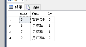 declare @level int declare @node int declare @num int declare @ResTab table ( node int not null, lv int not null ) set @level=0 -- 表示初始的等级 set @node=3 --表示初始的节点ID,即从指定的哪个节点开始查找 set @num=1 -- 指定递归层级,即循环的次数 insert into @ResTab -- 为表变量插入初始的数据 select Id,@level from Role_CTE where Id=@node while(@@ROWCOUNT>0 and @level<@num) begin set @level=@level+1 insert into @ResTab select b.Id,@level from @ResTab a join Role_CTE b on a.node=b.ParentId and lv=@level-1 -- join 等于 inner join(内连接)和自连接 end select a.node,b.Name,a.lv from @ResTab a left join Role_CTE b on a.node=b.Id