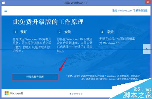2、然后就会看到预定Windows 10的界画,然后再点击【预定免费升级版】。