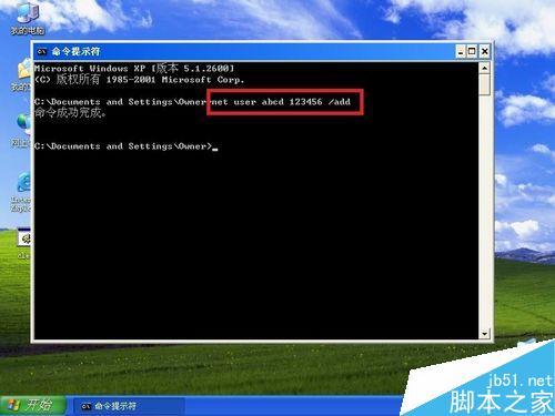 2、输入 net user abcd 123456 /add; 其中abcd为用户名,123456为密码,这两个可以根据自己的需要更改。