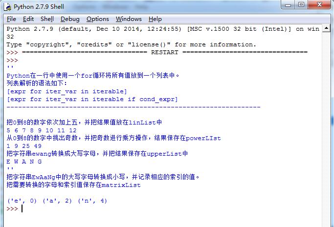#coding=utf8 print ''''' Python在一行中使用一个for循环将所有值放到一个列表中。 列表解析的语法如下: [expr for iter_var in iterable] [expr for iter_var in iterable if cond_expr] ----------------------------------------------------------------- ''' print "把0到8的数字依次加上五,并把结果值放在linList中" intList=[x+5 for x in range(8)] for ele in intList: print ele, print print "从0到8的数字中挑出奇数,并把奇数进行乘方操作,结果保存在powerLIst" powerList=[x **2 for x in range(8) if x%2] for pl in powerList: print pl, print print "把字符串ewang转换成大写字母,并把结果保存在upperList中" upperList=[char.upper() for char in "ewang" ] for up in upperList: print up, print print ''''' 把字符串EwAaNg中的大写字母转换成小写,并记录相应的索引的值。 把需要转换的字母和索引值保存在matrixList ''' str='EwAaNg' matrixList=[(char.lower(),index) for char in str if char.isupper() for index in range(len(str)) if str[index].isupper() and str[index]==char] for mat in matrixList: print mat, print