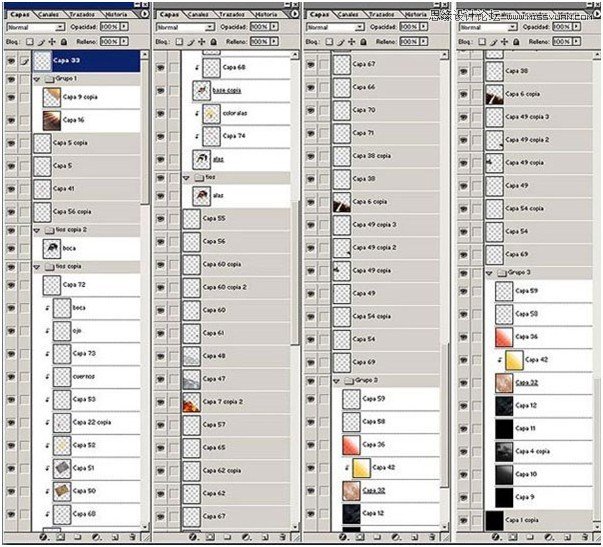 这是在photoshop中所有的图层,在photoshop中对图象做了很多的调整,几乎所有的贴图都是在这里完成的.我使用了很多贴图和图片来产生火、烟、云以及灰尘等。同样还渲染了更多的角色来给图像增加更多的效果。我希望你在这篇教程中能学到一些你需要的东西以及在你做一些复杂的场景的时候需要避免的一些错误(图22)。