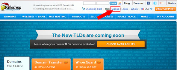 登陆Namecheap官网首页之后看到顶部的”SIGN UP”文字链接即为注册账户入口;