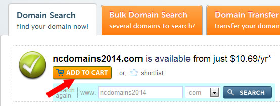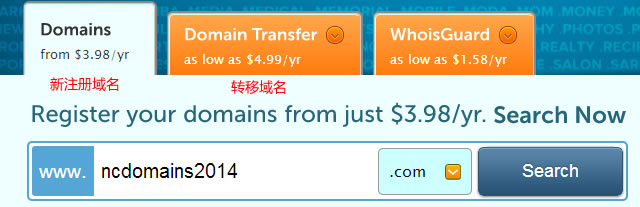 看到首页的上图,输入自己需要注册的域名以及后缀,点击SEARCH按钮检测是否被注册;顺便说一下,如果需要转入,看到上图的DOMAIN TRANSFER按钮之后就是转入域名步骤;