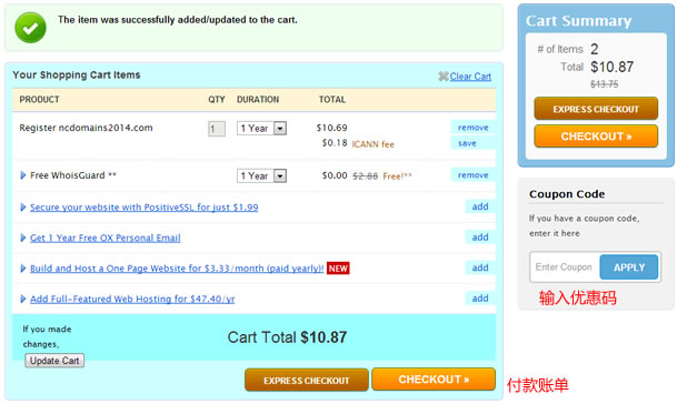 在账单列表中我们看到域名原价,可以在Coupon Code文本中输入最新的Namecheap优惠码,点击APPLY按钮激活之后价格会降低,.COM域名优惠之后是9.61美元,送一年隐私保护。