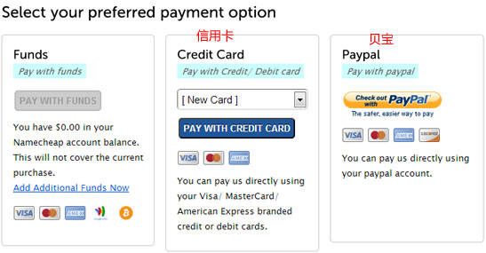最后,付款的时候我们可以用信用卡或者贝宝付款。付款之后在域名列表中会有看到购买的域名。
