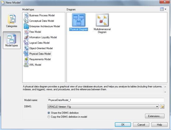 选择菜单File->New Model,【Model type】选择Physical Data Model,【Model name】 自由定名,【DBMS】选择“ORACLE Version 11g”,点击OK。