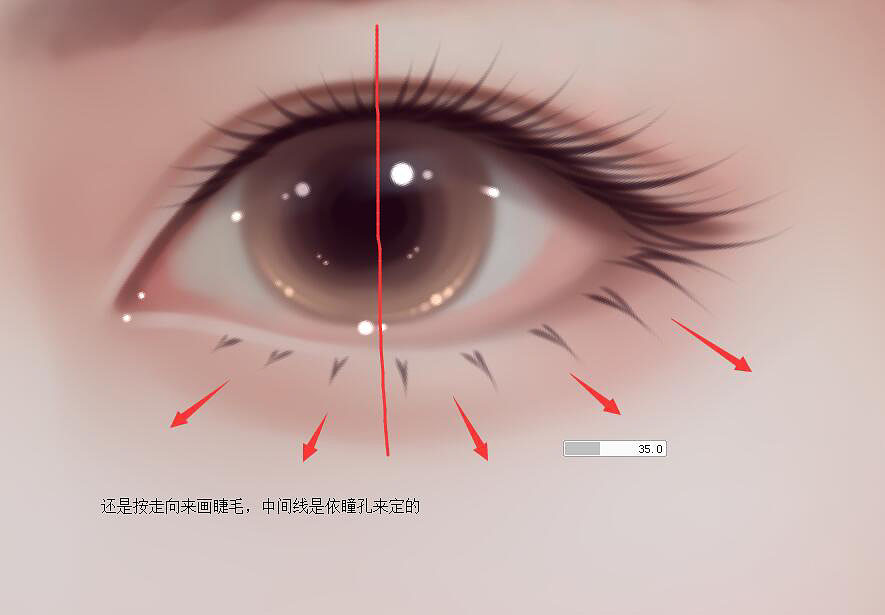 13、还是按走向来画睫毛,中间线是依瞳孔来定的。