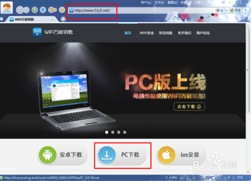 方法/步骤: 直接登陆“wifi万能钥匙”官方网站,从其主页中下载“wifi万能钥匙PC版”进行下载。