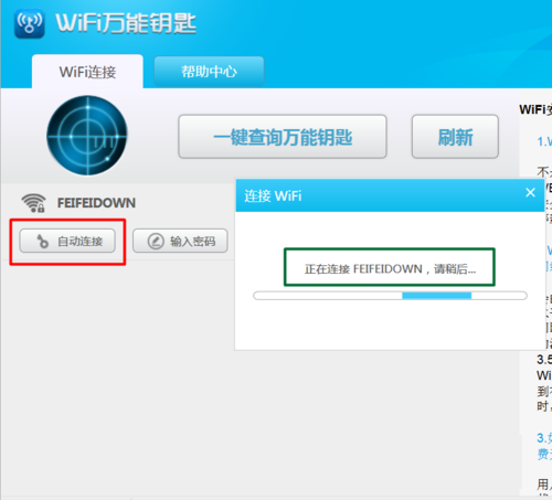 当周围存在wifi热点信息时,将会被列出,点击要进行连接的“wifi热点”,从弹出的扩展菜单中点击“自动连接”按钮,此时程序就试图通过破解来完成连接操作。