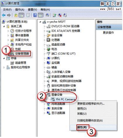 2、在“计算机管理”窗口左边一栏,双击“设备管理器”。然后,从右边栏中找到“图像设备”,点开。在摄像头设备上右键鼠标,选择“属性”。