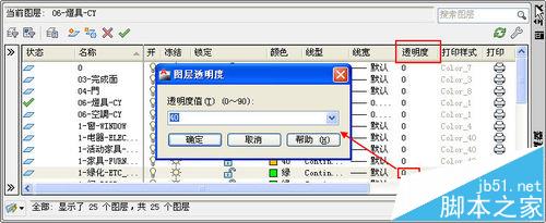 1、在CAD中打开图层管理器对话框,可以看到有一列是透明度,单击图层后面的透明度值,就会弹出图层透明度对话框,在其中可以输入透明度的数值,如下图所示。