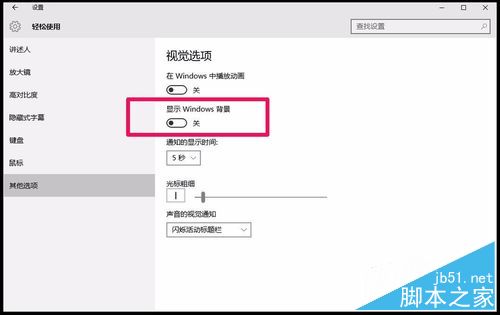 4)现在我们可以看到视觉选项下:显示Windows背景的开关处于“关”的位置,这就是桌面无背景图片显示全黑色的原因;