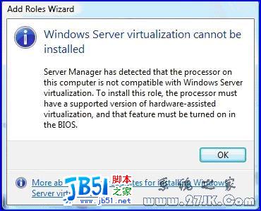 3、Windows Server 2008操作系统内建了Sysprep, 可以在C:\windows\system32\sysprep\sysprep.exe下找到。 它只有sysprep.exe一个文件,而Windows Server 2003中的Sysprep是由3个文件构成:SYSPREP.EXE、SETUPMGR.EXE和SETUPCL.EXE,咱可以在Window Server安装光盘的\Support目录下找到哦。 4、如果出现下图的提示信息,就表明CPU不支持硬件辅助虚拟化,会无法安装“Windows Server 虚拟化”角色,也就不能增加并运行虚拟机了,需要注意哦。