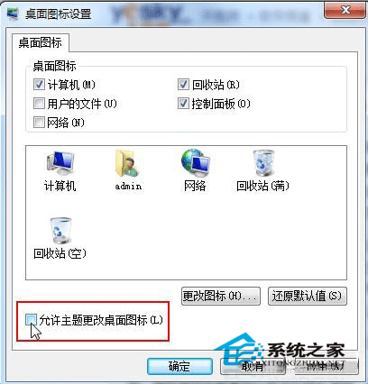 在“桌面图标设置”对话框中,将“允许主题改变桌面图标”前面的复选框取消勾选,然后单击“确定”。