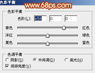 3、创建色彩平衡调整图层,对阴影、中间调、高光进行调整,参数设置如图9 - 11,确定后把蒙版填充黑色,用白色画笔把头发部分擦出来。这一步给头发增加橙红色。