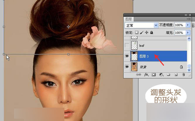 模特的头发不够饱满,局部选择头发的部分,Ctrl+J,复制所选择区域自动新建一层。然后新图层上Ctrl+T,用变换工具适当的拉伸头发让形状更对称。