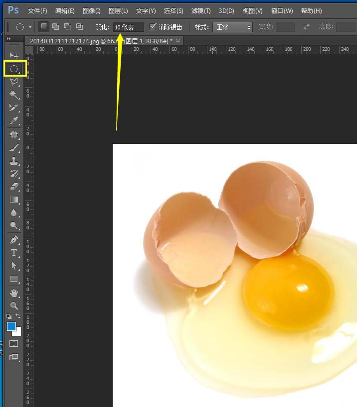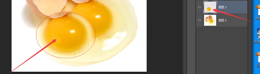 1、选一张带有鸡蛋黄的图片,点击图片直接拖拽到PS软件中 ,自动打开文件。在右面图层上双击,确定。然后选择左侧“选框工具”
