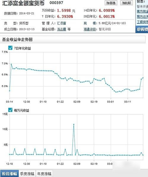 由图中可见,3月21日汇添富全额宝货币基金万份收益为1.5998元,7日年化收益已达6.3930%,高于目前众宝宝理财货币基金。