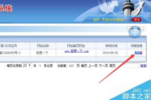 5、网站的备案后的部分信息,会被查询出来,显示出备案的许可证号,网站名称,等相关的信息内容。如果要看详细的信息,可点击“详细”。
