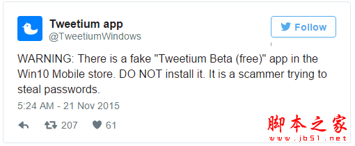 以上就是微笑万宝路最近收集整理的关于Win10 Mobile虚假应用Tweetium Beta混迹商店:窃取用户密码的全部内容,更多相关Win10内容请搜索靠谱客的其他文章。