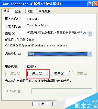 4、点击【停止】按钮,将计划任务服务停止,在【服务状态】中显示【已停止】,如图所示: